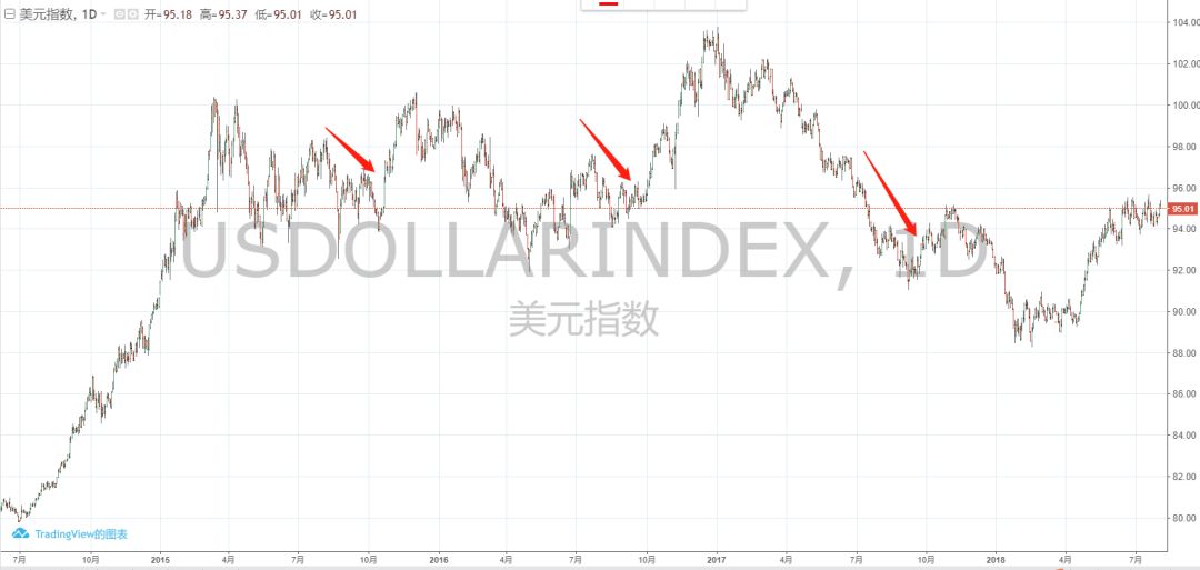与此同时,美元指数则迅速上涨,3日下午突破95关口,之前美联储对美国经济的乐观评估,以及国际贸易局势,再度趋紧提振美元。